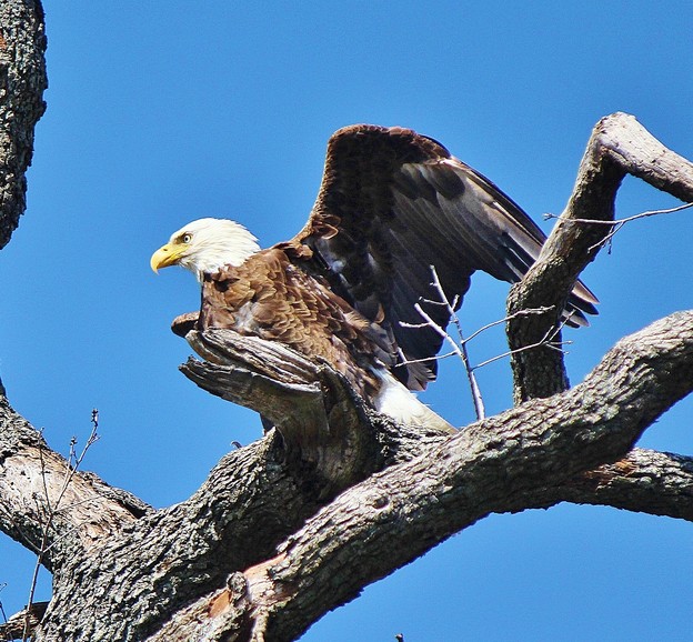 Oh, my bald eagle, Eddy, was here again Saturday. We took the boys for a walk around the lakes, and there he was, sitting in a huge oak. Didnt have my camera, hard to take pictures with a mastadon pulling on the leash. He let us get within 50 feet of his beautiful self. Other folks were jogging or walking their dogs, and we got their attention and pointed up into the tree, and only a few were slightly curious...amazing! One did say "oh wow"...I guess thats something!